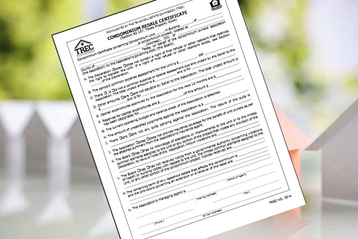 This service includes the form "SUBDIVISION INFORMATION, INCLUDING RESALE CERTIFICATE FOR PROPERTY SUBJECT TO MANDATORY MEMBERSHIP IN AN OWNERS’ ASSOCIATION", along with a visual inspection of the property to communicate any existing maintenance violations, provision of governing documents and required HOA disclosures to make sure that buyer's are fully aware of HOA use restrictions.